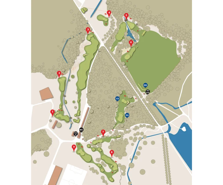 • Vadišče za dolge udarce (Driving Range): Tukaj lahko igralci vadijo dolge udarce in izboljšajo svojo moč ter natančnost.